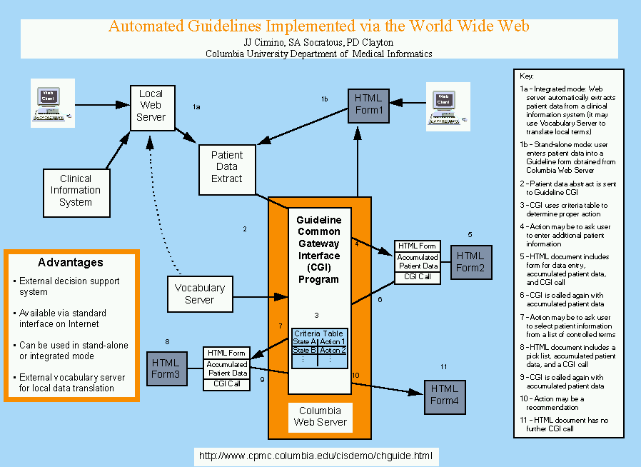 The poster illustrates how the various components in the process interact and shows how a single, self-contained CGI, together with a vocabulary server, can function as an institution-independent, automated decision support resource on the Internet.